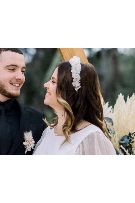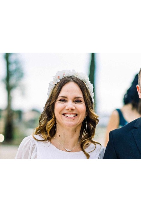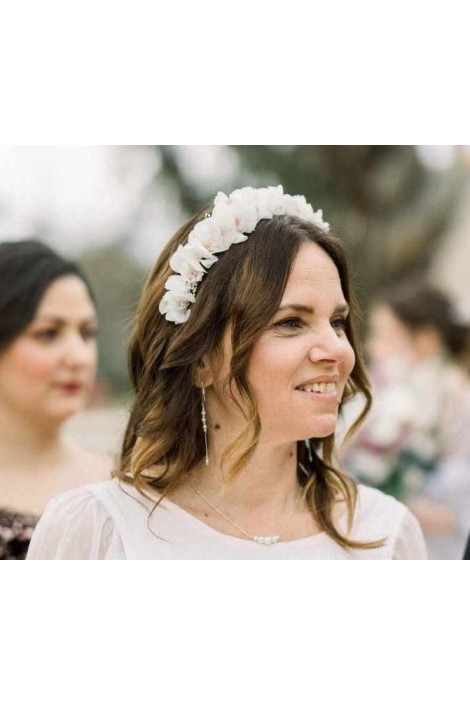 Serre-tête léger et raffiné recouvert de fleurs d'hortensia blanches stabilisées et quelques petites fleurs rose, idéale à porter sur des cheveux libres