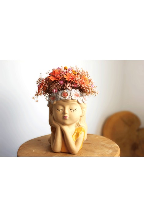 Vase en céramique en forme de petite fille aux yeux fermés, composé de gypsophile rose 4 zinnias oranges .