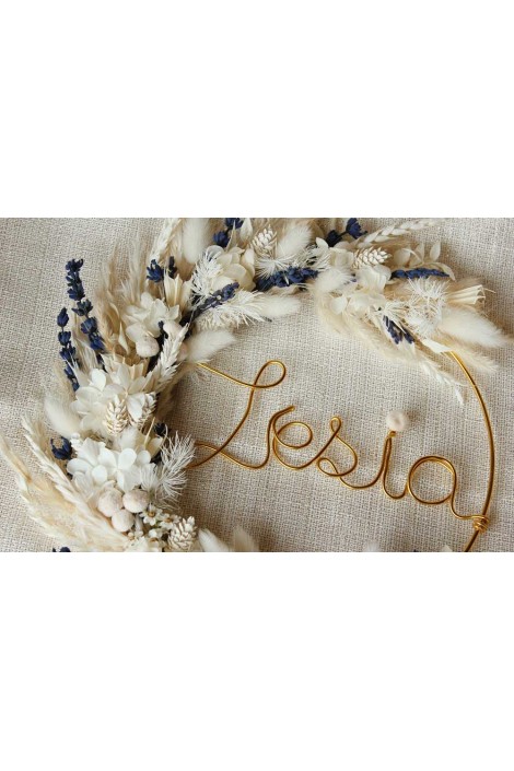 Couronne en métal dorée de 20 cm de diamètre, décorée en fleurs naturelles séchées et stabilisées.