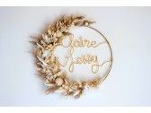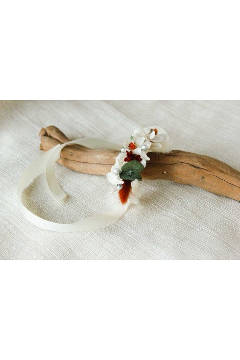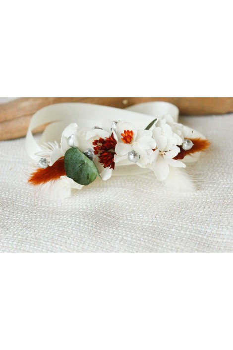 Ce bracelet est réalisé sur une base très douce de fleurs d’hortensia et lagurus blancs puis subtilement décoré de fleurs séchées orangée, vert et de boules de lin argentés sur un ruban de satin.