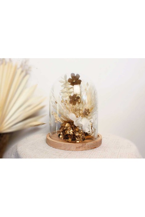 Cloche en verre décoré den fleurs séchées et stabilisées dans les tons de blanc et de doré.