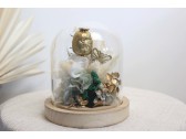 Cette petite cloche est garnie de mini pommes de pins, de fleurs de nigelle, d'hortensia pourpre , lagurus phalaris, sur un base de mousse verte stabilisée;